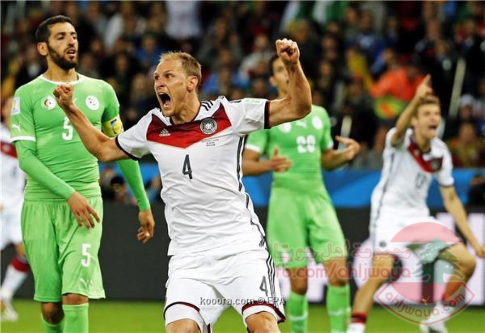 نجا المنتخب الألماني من الكابوس الجزائري وتأهل لدور الثمانية من بطولة كأس العالم المقامة حالياً في البرازيل، بعد فوزه بهدفين لهدف في مباراة امتدت للأشواط الإضافية بعد التعادل في الوقت الأصلي بدون أهداف. وسجل شورليه هدف التقدم الألماني في الدقيقة 92 بالشوط الإضافي الأول، ومسعود أوزيل في الدقيقة 119، لتعود الجزائر بعدها بدقيقة وتقلّص الفارق عبر جابو، وبذلك تضرب ألمانيا موعداً كروياً كبيراً مع فرنسا يوم الجمعة القادم في ريو دي جانيرو. وكانت المباراة ندّية على أعلى مستوى من الفريقين، وأظهرت الجزائر مستوى فني وبدني وتكتيكي عالي المستوى وهددوا المرمى الالماني كثيراً لولا قلة التركيز وتألق الحارس مانويل نيوير الذي غطّى كثيراً على بطء دفاع فريقه وأنقذهم في عديد الهجمات الخطيرة. في الشوط الأول فاجأ المنتخب الجزائري الألمان بسرعة هجومية وتنظيم هجمات خاطفة في العمق الدفاعي للألمان. أولى التهديدات الجزائرية كانت في الدقيقة التاسعة حينما استغل ياسين براهيمي تمريرة خاطئة من الظهير الألماني شكوردان مصطفى لينطلق خلف الكرة نحو مرمى نيوير الذي لعب دور الليبرو وأبعد الكرة، ليرد شفاينشتايجر بتسديدة صاروخية صدها الحارس مبولحي (ق 13)، ويأتي الرد الجزائري مرة أخرى بعدها بدقيقة من سفيان فيجولي الذي راوع الدفاع الألماني ولكن سدد الكرى فوق مرمى نيوير. وألغى الحكم في الدقيقة 16 هدفاً سجله سليماني بداعي التسلل، وبعدها بدقيقة واصل الجزائريون اهدار الفرص بعدما انفرد فوزي غلام بالحارس نيوير لكن سددها على خارج المرمى. وفي الدقيقة 39 أطلق مهدي مصطفى تسديدة بعيدة كانت في طريقها للمرمى لولا اصطدامها بالمدافع بواتينج، ليرد عليه توني كروس بتسديدة قوية تصدى لها مبولحي بصعوبة لترتد لجوتزه الذي يسددها وينقذها مبولحي مرة أخرى ويمنع هدف ألماني محقق. في الشوط الثاني واصل المنتخب الجزائري تقديم أداء تكتيكي وفني قوي، استطاع من خلاله ايقاف الخطورة الألمانية. في الدقيقة 48 واصل مبولحي تألقه وتصدى رأسية للألماني مصطفي، وتصدى مرة أخرى لتسديدة قوية من فيليب ويمنع هدفاً محققا (ق 54). وواصلت الجزائر غاراتها الهجومية على مرمى ألمانيا بالمرتدادت والتسديدات لكن تألق الحارس نيوير والذي لعب كثيراً بدور الليبرو في الدفاع الألماني منع الجزائريين من التهديف. وعاد مولر في الدقيق 78 ليهدد دفاعات الجزائريين ويرسل عرضية سددها شفاينشتايجر برأسه لتمر بجوار القائم الأيمن. في الدقيقة 80 منع مبولحي أخطر فرصة ألمانية في اللقاء بعدما تصدى لرأسية مولر، لتعود لشورليه الذي يسددها في المرمى ويبعدها رفيق حليش. وعاد مولر بعدها بدقيقة ليتسلم كرة بمهارة عالية في منطقة جزاء الجزائر ويسدد الكرة نحو مرمى مبولحي لكن تمر بجوار القائم وتضيع فرصة أخرى للألمان. وفي الدقيقة 88 انفرد فيجولي بالحارس نيوير الذي لعب خرج مجدداً من مرماه ليلعب دور الليبرو، ليرد عليه مبولحي بتألق آخر ويتصدى لرأسية شفاينشتايجر الخطيرة، لينتهي الشوط الثاني بالتعادل السلبي. وفي الدقائق الأولى من الشوط الإضافي الأول أنهى شورليه الصيام التهديفي للمباراة بتسجيله هدفاً بالكعب بعد عرضية من مولر. وكاد مهدي مصطفى يعادل النتيجة بتسديدة قوية من داخل منطقة جزاء الالمان لكن تمر الكرة بجوار القائم ( ق 98 ). وتراجعت الجزائر بدنياً في الأشواط الإضافية ليستغل الألمان ذلك بفرض سيطرة نسبية على الملعب وينخفض نسق المباراة بشكل ملحوظ. وفي الدقيقة 117 أنقذ مبولحي فريقه من انفراد للبديل الألماني كرامر، ليرد سليمان بانفراد في عمق الدفاع الألماني لولا تدخل بواتينج في اللحظة الأخيرة. وشهدت الدقائق الأخيرة اثارة كبيرة شهدت تسجيل هدفاً لكلا الفريقين. حيث استغل الألمان في الدقيقة 119 مرتدة تجاه المرمى الجزائري الذي شهد مساحات واسعة ليسجل اوزيل الهدف الثاني. ويرد عليه جابو بهدف بتسديدة قوية أسكنها مرمى الجزائر بعدما استلم عرضية متقنة من سفيان فيجولي، وكادت الجزائر تصنع المعجزة وت